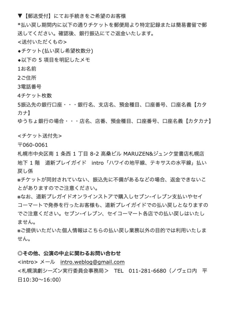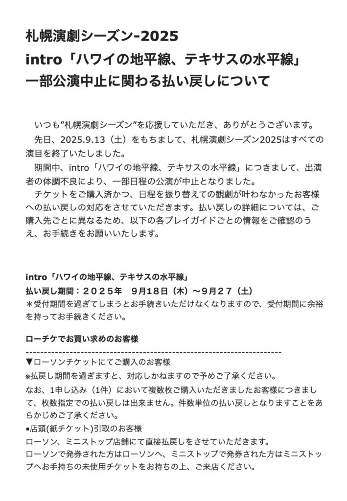 札幌演劇シーズン-2025 intro「ハワイの地平線、テキサスの水平線」一部公演中止に関わる払い戻しについて